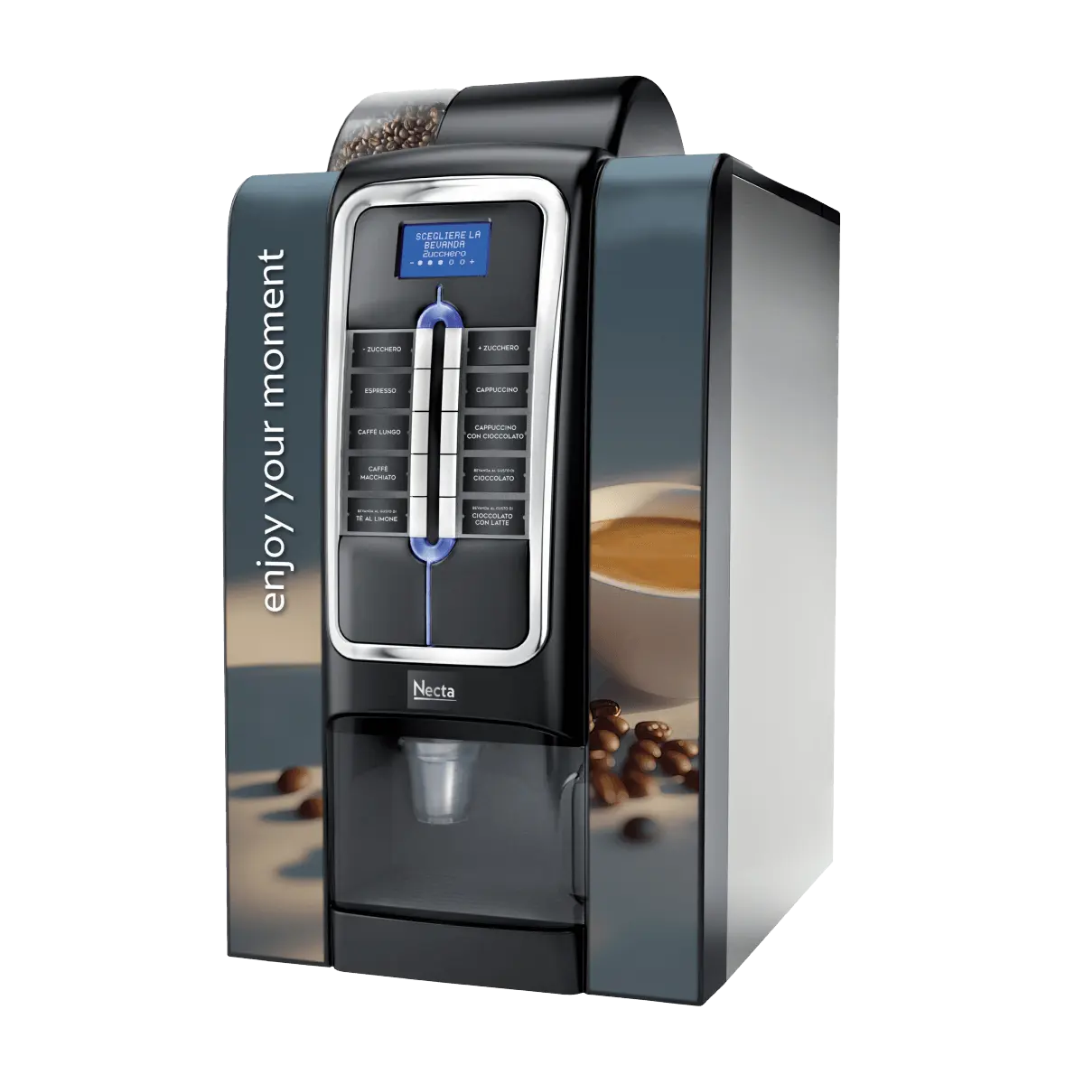 Este modelo de sobremesa destaca por su diseño elegante y moderno, su gran capacidad de dispensación y su excelente rendimiento tecnológico. La iluminación LED realza el diseño, junto con el marco cromado que rodea el área de selección. Compacta y sofisticada, la Barista 200 lleva la calidad de Necta a todos los niveles.
