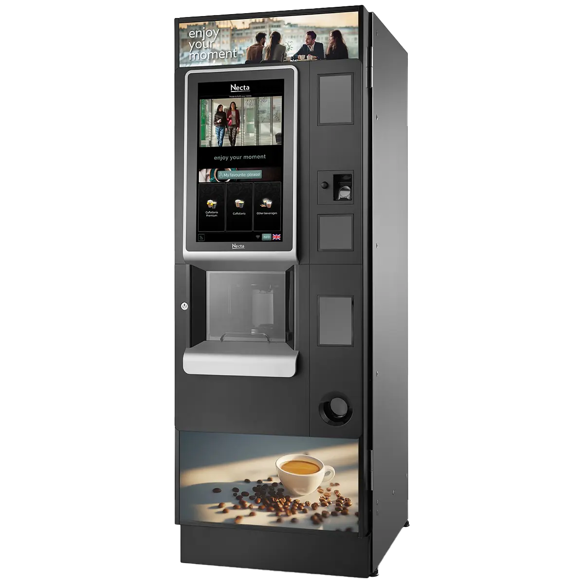 La pantalla táctil inclinada y ergonómica guía al usuario desde la selección de la bebida hasta la entrega. Su interfaz personalizable de 21,5”, impulsada por tecnología HTML5, mejora la visibilidad de los productos y simplifica el proceso de compra, ofreciendo una experiencia intuitiva y atractiva.